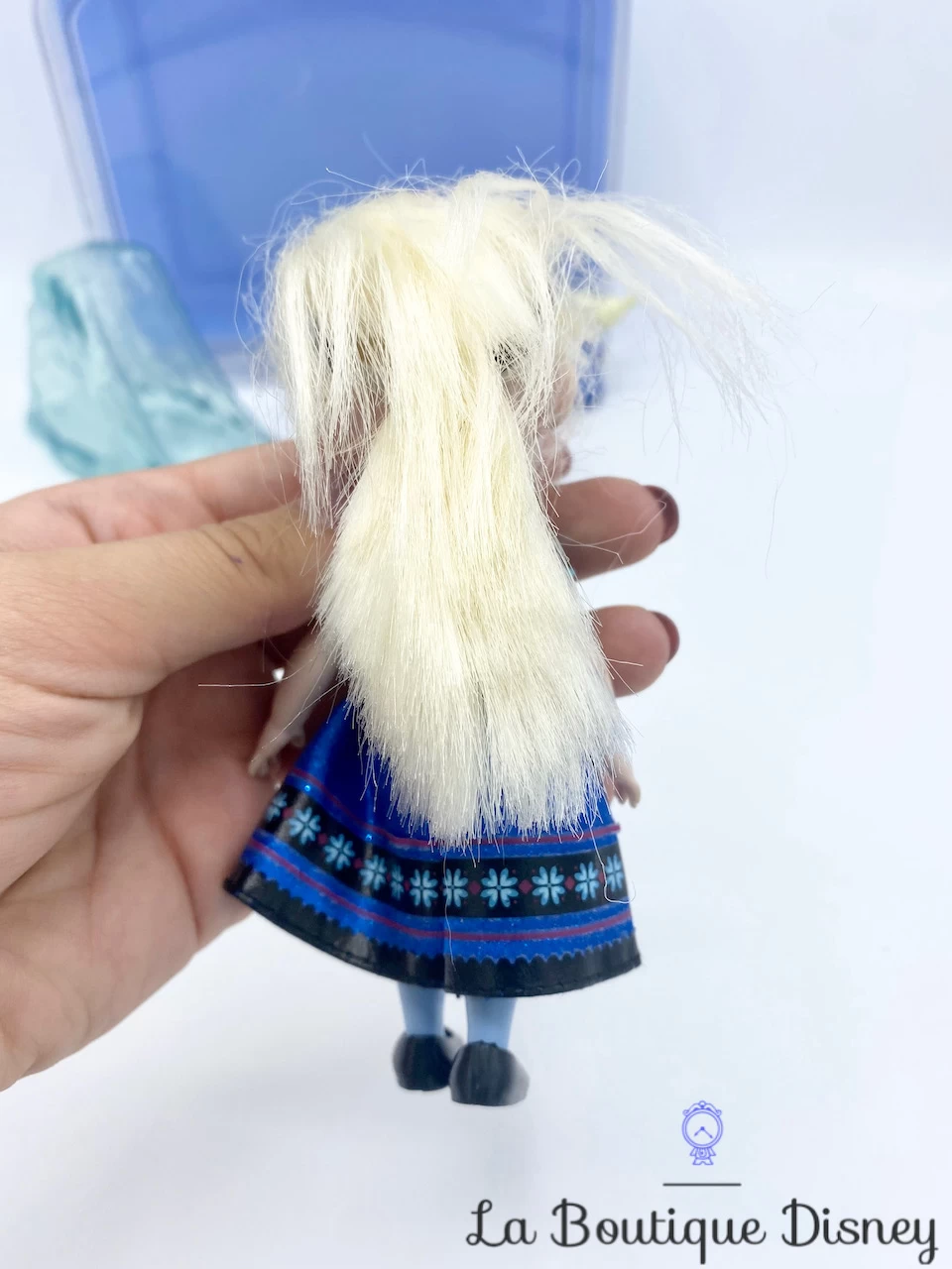 Ensemble de jeu avec Mini Poupée en plastique représentant la reine du royaume d’Arendelle Elsa. Coffret de 7 pièces inspirées du film La reine des neiges : petite poupée, bloc de glace, glace magique, Olaf le bonhomme de neige, doudou d’Elsa, guitare et verre. Elsa a une chevelure blonde très réaliste avec sa petite frange, elle porte sa robe bleue à paillettes. Sa tête, ses bras et ses jambes sont articulées. La petite valise transparente et bleue a une poignée de transport à paillettes bleue pour pouvoir emmener votre nouvelle poupée partout avec vous !