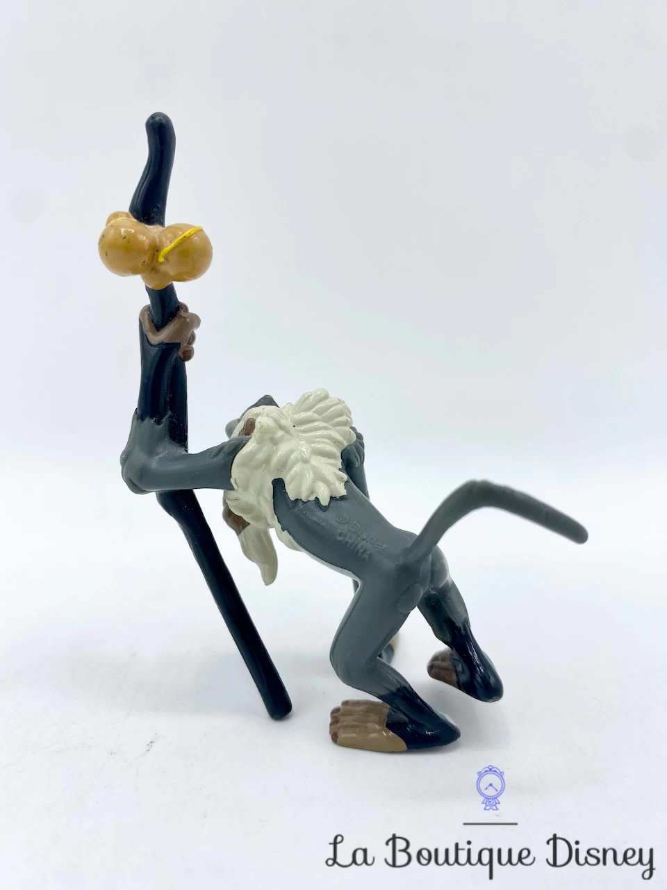 Figurine en plastique représentant Rafiki, le vieux singe conseiller, considéré comme le chaman de la tribu et parrain de Simba. Il est gris, noir et beige. Il a visage coloré en bleu et rouge. Il a une barbe en poils blancs et tient dans sa main un énorme bâton lui servant à transporter les fruits pour baptiser les lionceaux.