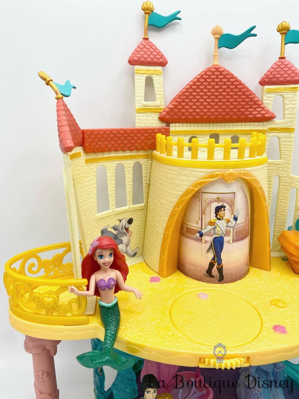 Ensemble de jeu comprenant un gros château en plastique avec un toboggan bleu. Le haut représente la partie « Terre » avec le palais du Prince Éric et le dessous représente la partie « Mer » avec la grotte d’Ariel et la sculpture du Prince Éric. L’ensemble est fourni avec deux figurines : Ariel et le Prince Éric.