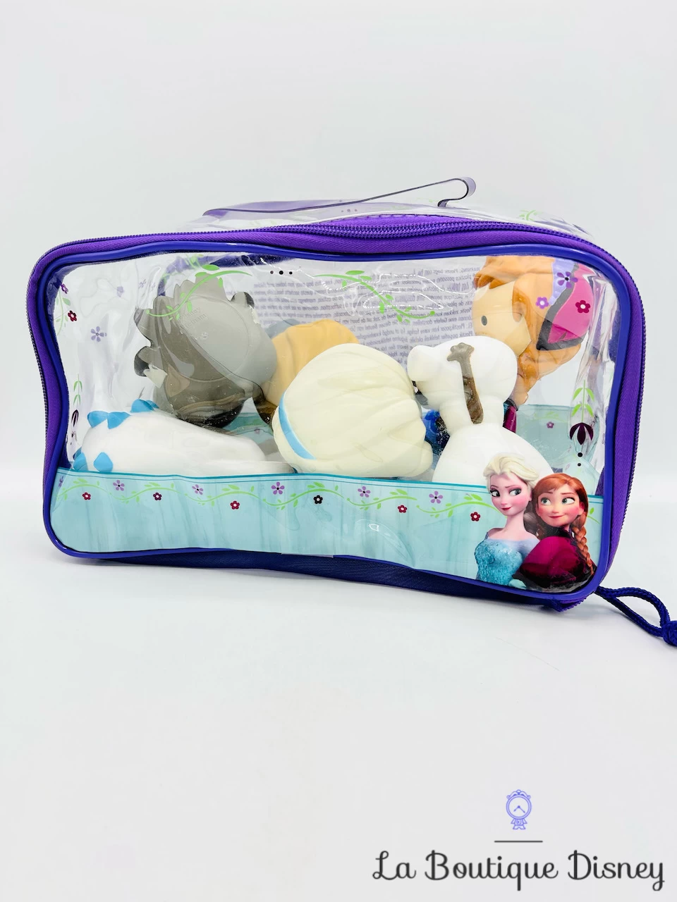 Ensemble de 6 figurines de bain issues du dessin animé La Reine de Neiges. Vous retrouvez notamment Elsa, Anna, Kristoff, Sven, Olaf et Guimauve. Les figurines sont pourvues d’un petit trou en dessous pour évacuer l’eau et sont en plastique souple. Elles sont vendues dans leur pochette de rangement en plastique.