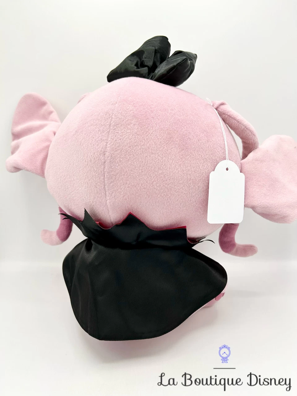 Peluche de Angel, notre petit monstre extraterrestre rose préféré, sortie à l’occasion des 15 ans du parc japonais Tokyo Disney Sea ! Elle est ici représentée avec un petit corps et une grosse tête. Elle porte une cape noire et violette avec un noeud noir sur la tête. Sur la cape, il y a l’inscription « 15 Tokyo Disney Sea ». Peluche tenant bien assise.