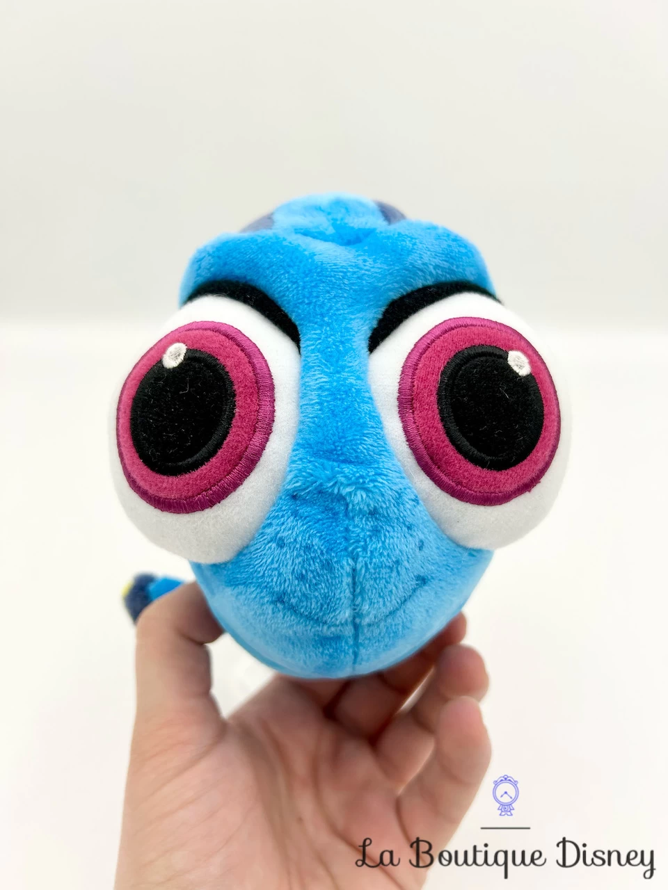 Peluche de Dory, un poisson bleu et jaune avec des problèmes de mémoire. Elle a de grands yeux brodés et un sourire brodé. Elle est ici représentée quand elle était bébé poisson.