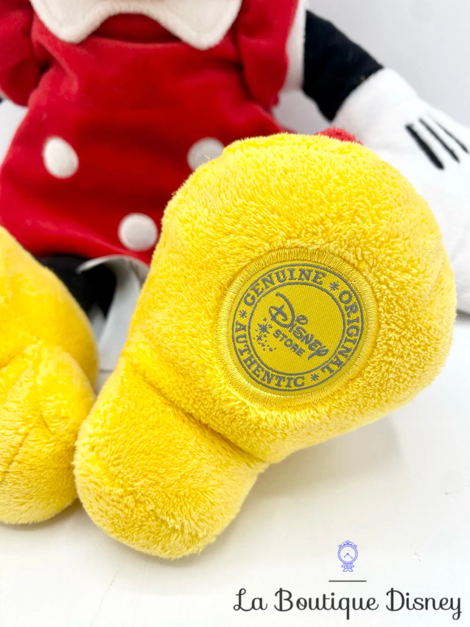 Peluche en polyester de Minnie Mouse portant sa tenue classique. Sa robe est rouge avec des pois blancs. Ele a un gros noeud assorti sur la tête. Visage brodé. Chaussures jaunes avec l’écusson « Disney Store Original Authentic ». Grand format 52 cm.