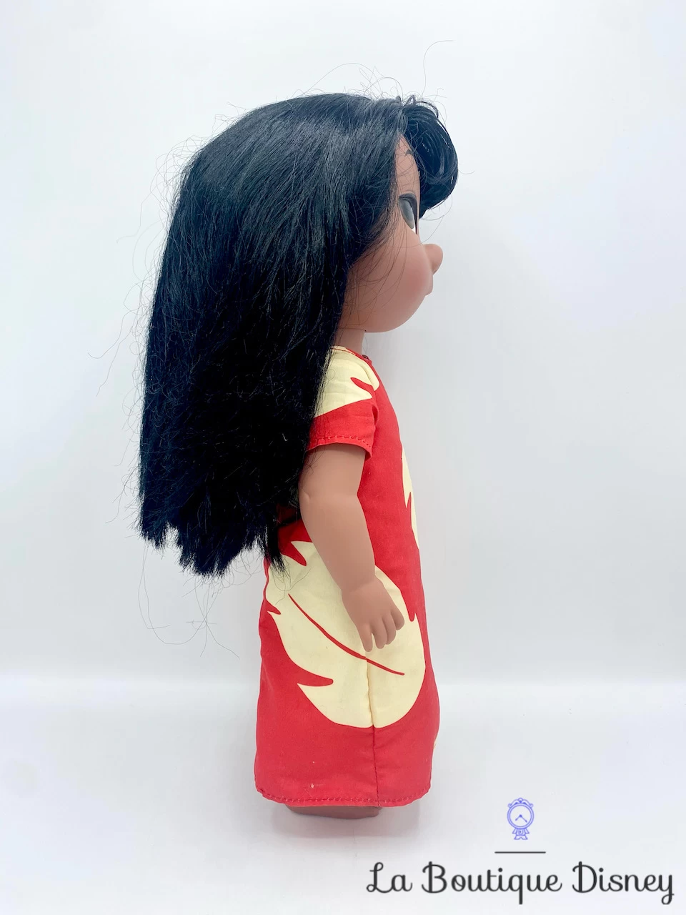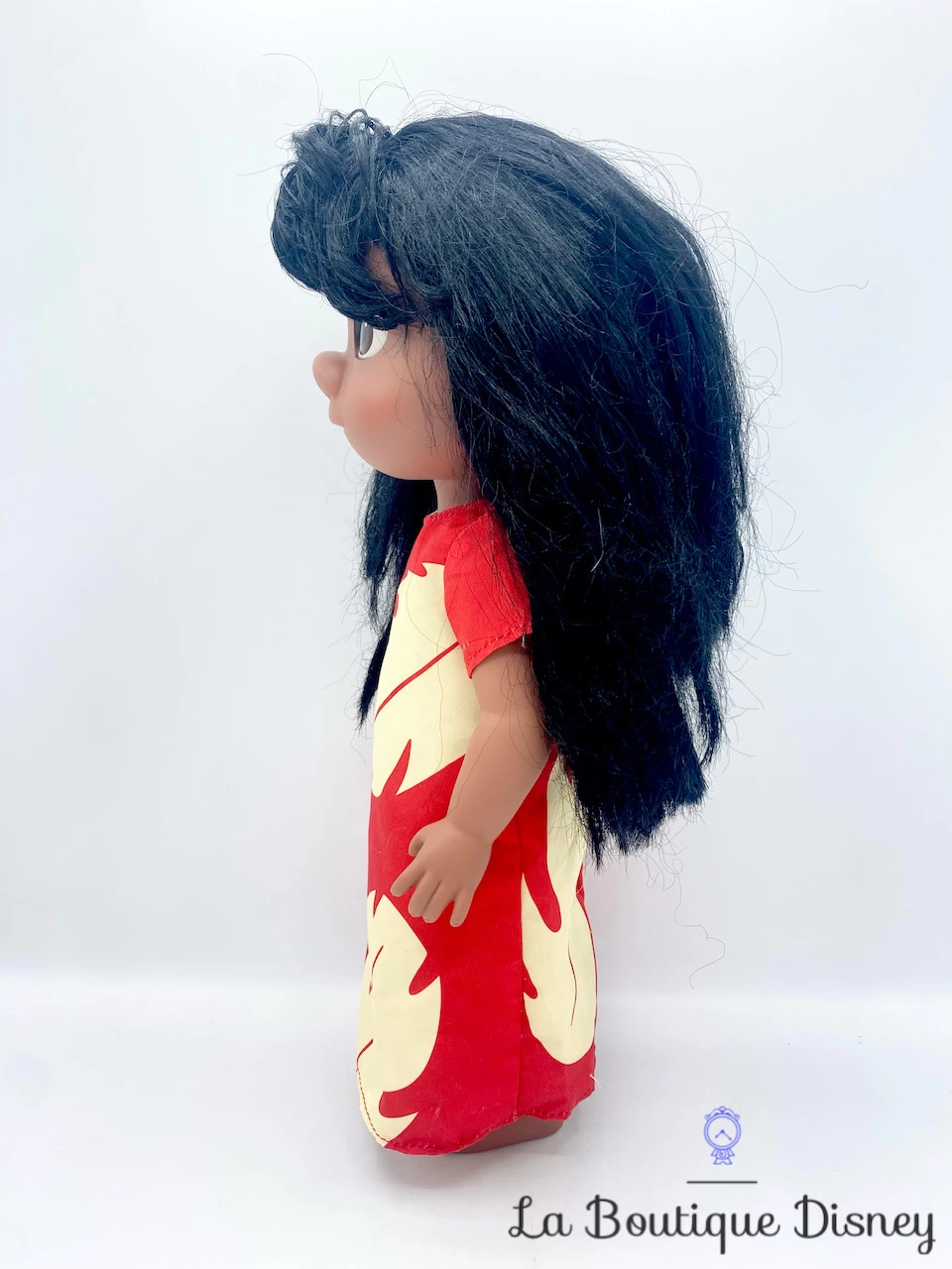 Poupée en plastique représentant la petite fille Hawaienne, Lilo ! Elle a sa tête, ses bras et ses jambes articulés. Lilo a des cheveux noirs avec une petite frange. Elle porte une robe classique rouge avec des motifs de feuilles. Elle a de beaux yeux marron. Poupée très réaliste fidèle au film Walt Disney !
