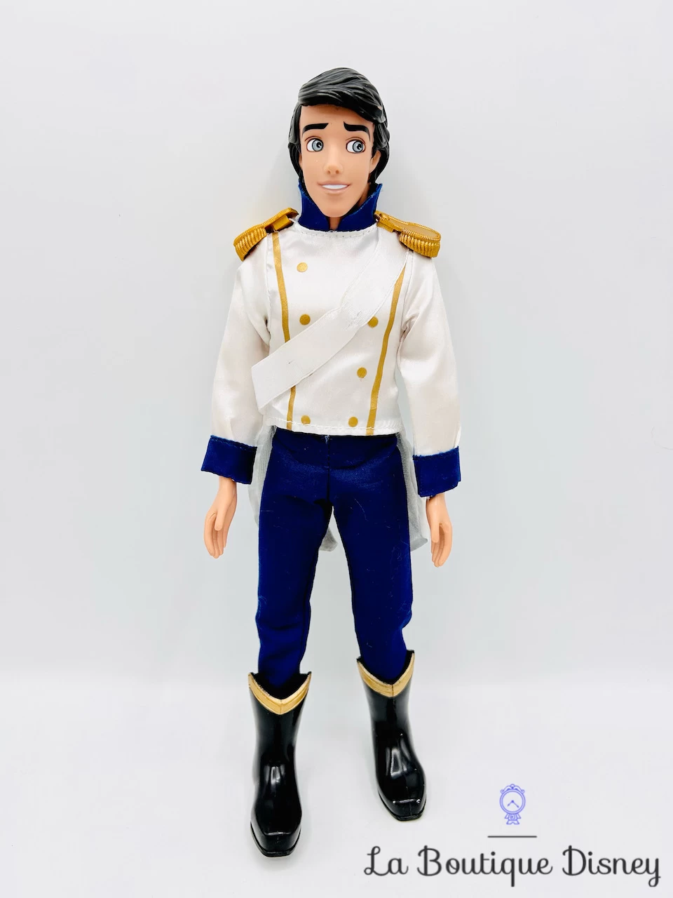 Poupée mannequin articulée du Prince Eric, l’amoureux de la princesse La Petite sirène. Il porte sa tenue de mariage à savoir une chemise à queue de pie blanche satinée à manches longues, des épaulettes couleur or, un pantalon bleu et des grandes bottes noires. Il est prêt à se marier avec Ariel et à devenir son prince !